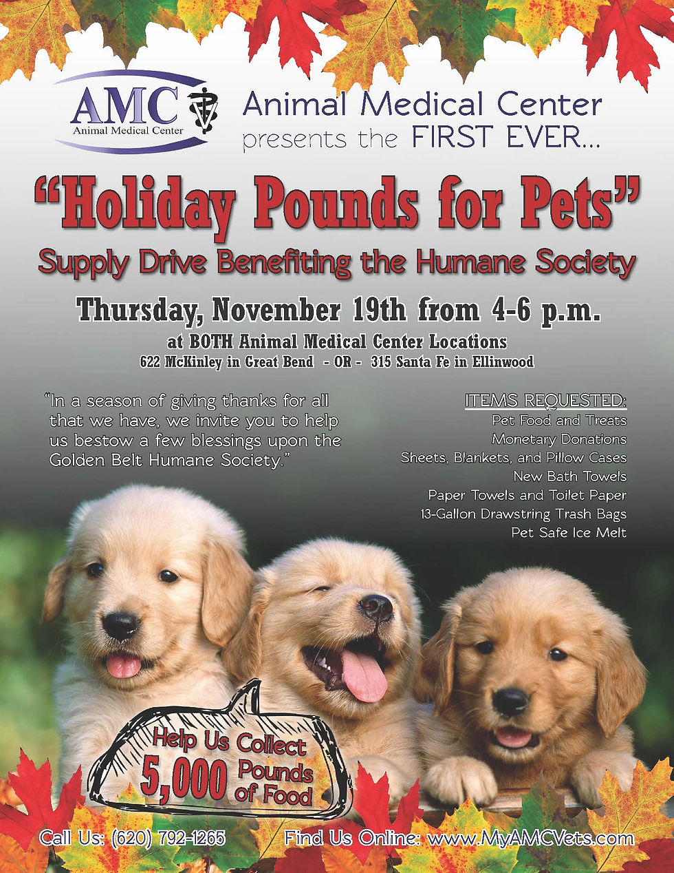 During the season of giving thanks, Animal Medical Center is igniting a new initiative to bestow a few blessings on their furry friends at the Golden Belt Humane Society. The growing veterinary practice recently announced plans to host the first ever “Holiday Pounds for Pets” Supply Drive on Thursday, November 19th from 4-6 p.m. at both of their clinic locations in Great Bend and Ellinwood.